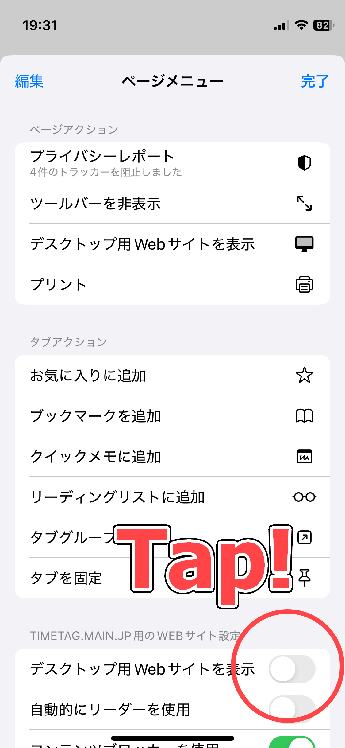 デスクトップ用Webサイトを表示:ON